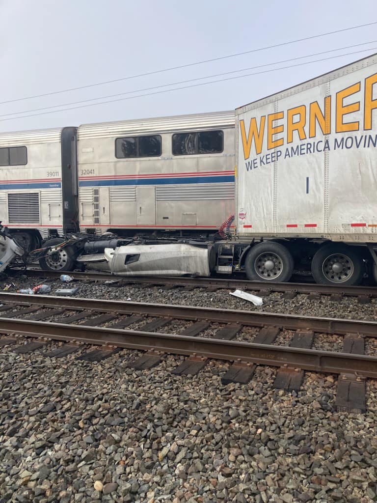 An Amtrak train struck a semi-truck stuck on the train tracks at 29th Street NW and B Street NW in Auburn on Saturday morning, but no injuries were reported, officials said.
