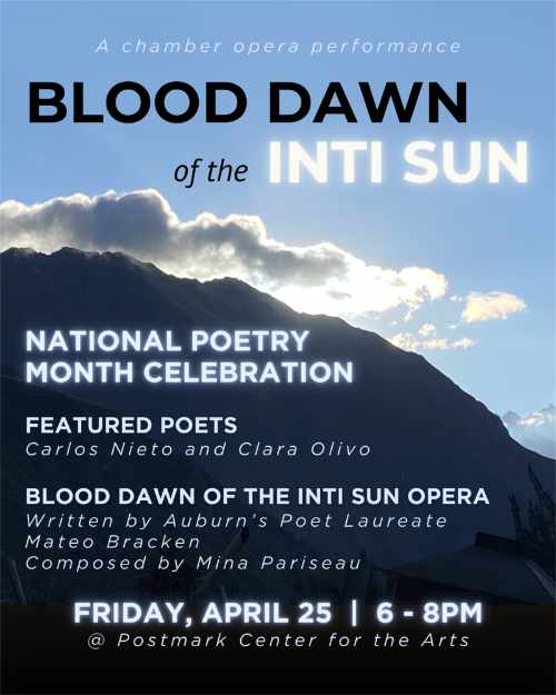 “Join us for a poetry celebration at Postmark Center for the Arts! Enjoy light refreshment and partake in this yearly celebration of literary art. Featured Readers: Poets Carlos Nieto and Clara Olivo will be the featured poets for this celebration of literary arts. Blood Dawn of the Inti Sun: Written by Auburn’s Poet Laureate Mateo Bracken and composed by Mina Pariseau, this chamber opera is a poetic retelling of an iconic Inca story detailing the beginnings of the capitol of the Inca empire. This performance will include an artist talk with the writer and composer, as well as a Q&A session for its performers.”