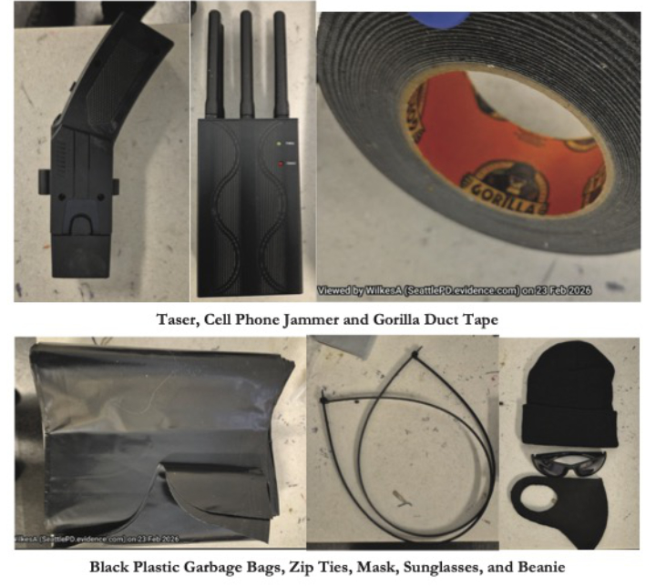 Police say the mail carrier bag Blair was carrying contained a device officers identified as a cell phone jammer, Gorilla tape, heavy duty plastic bags, zip ties, two unbranded tasers, a tourniquet, a beanie, mask and sunglasses capable of obscuring a person’s face, faraday bags and black plastic gloves.