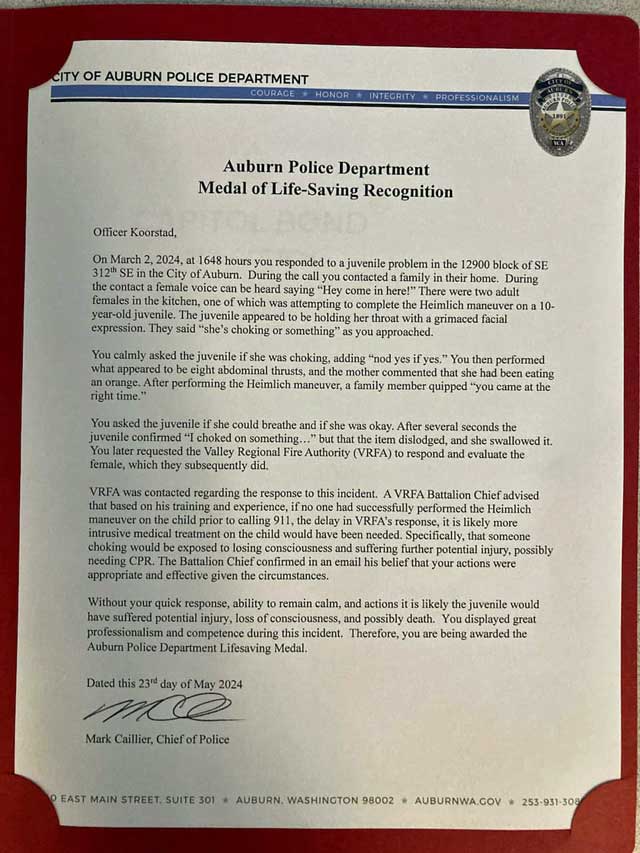 On March 2, 2024, at approximately 4:48 p.m., Officer Koorstad responded to a juvenile distress call in the 12900 block of SE 312th SE in Auburn. Upon arrival, he found a family in distress, with two adult women in the kitchen attempting to perform the Heimlich maneuver on a 10-year-old girl who was choking.
