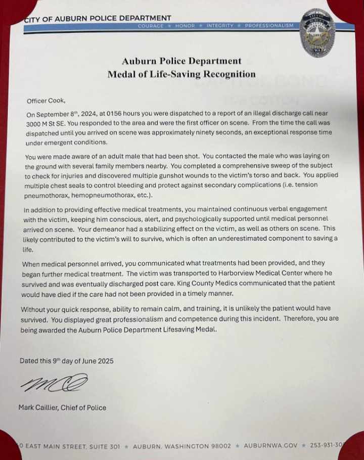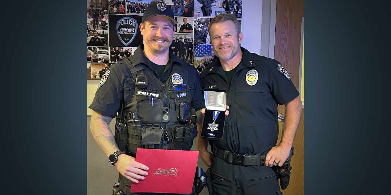 Auburn Police Officer Cook has been awarded the department’s Medal of Life-Saving Recognition for his swift and decisive actions in saving the life of a gunshot victim in September 2024.