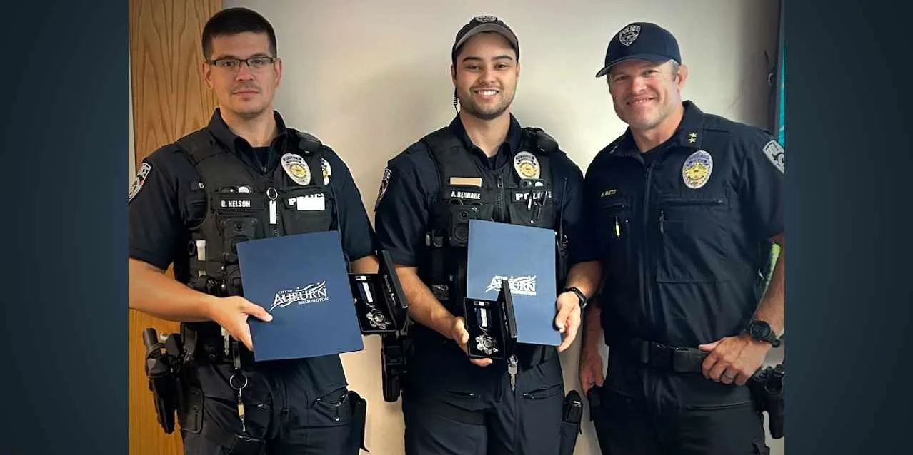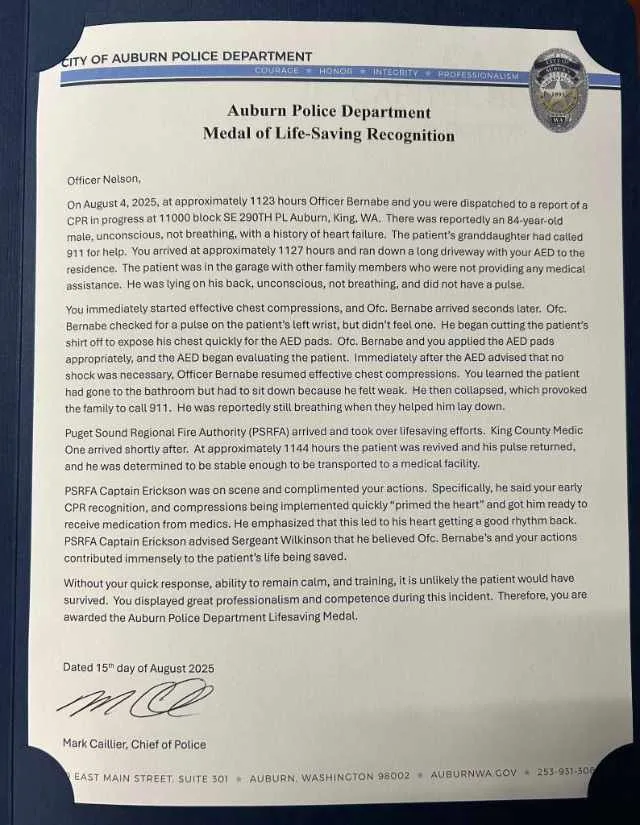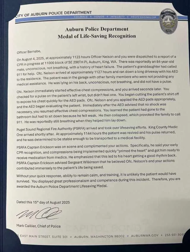 “Without your quick response, ability to remain calm, and training, it is unlikely the patient would have survived,” Auburn Police Chief Mark Caillier wrote in commendations presented to both officers. “You displayed great professionalism and competence during this incident. Therefore, you are awarded the Auburn Police Department Lifesaving Medal.”