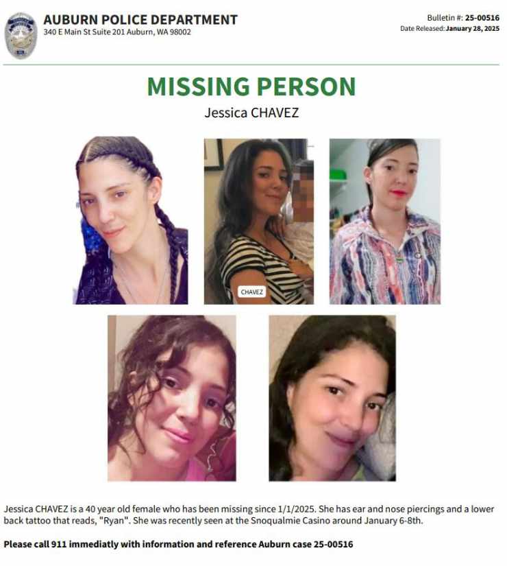 The Auburn Police Department is seeking assistance from the public in locating Jessica Chavez, a 40-year-old woman who has been missing since Jan. 1, 2025.
