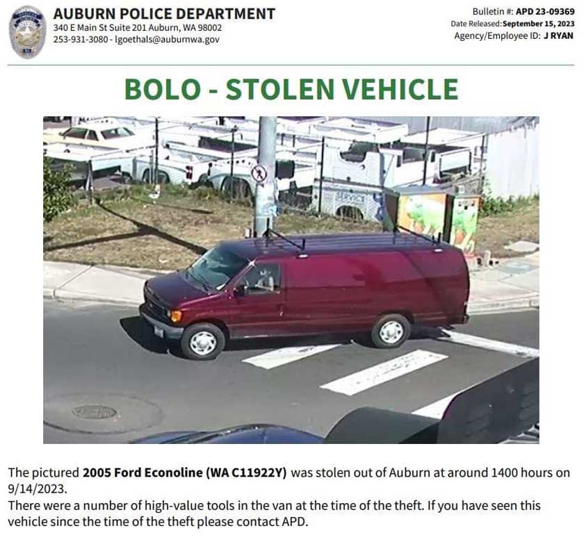Auburn Police are seeking the public’s help in finding the pictured 2005 Ford Econoline (WA C11922Y), which was stolen out of Auburn at around 2 p.m. on Thursday, Sept. 14, 2023.
