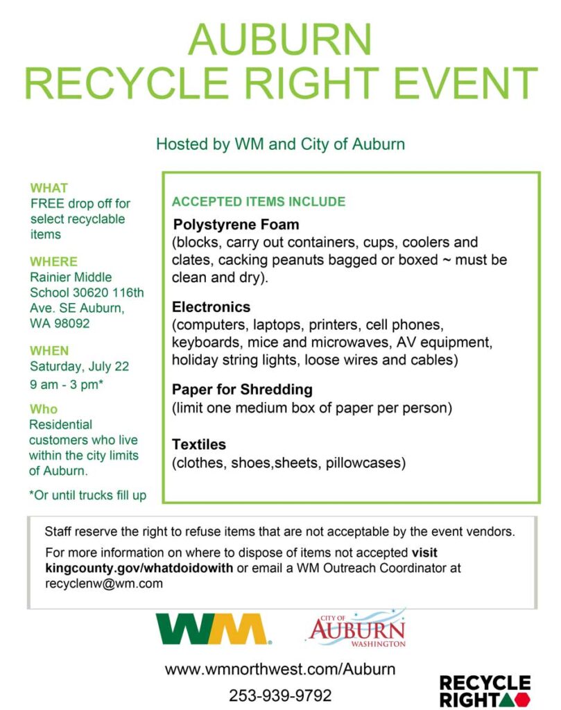 A WM Recycle Right Collection Event will be held on Saturday, July 22, 2023.