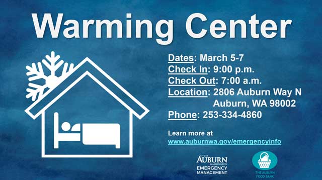 The Auburn Warming Center will be open through Thursday, Mar. 7, 2024, due to anticipated low temperatures.