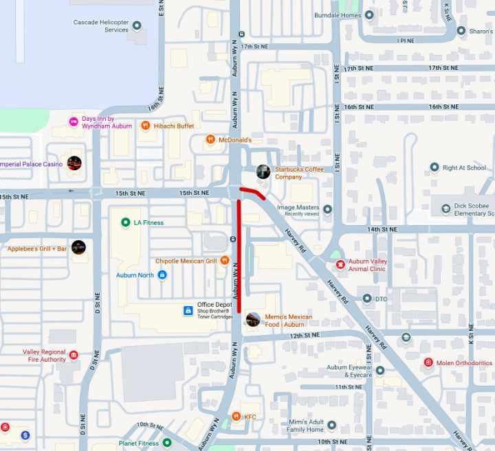 Northbound Auburn Way North is closed, and westbound Harvey Road is closed at the Starbucks Coffee Company driveway as crews work to repair the damaged pole.