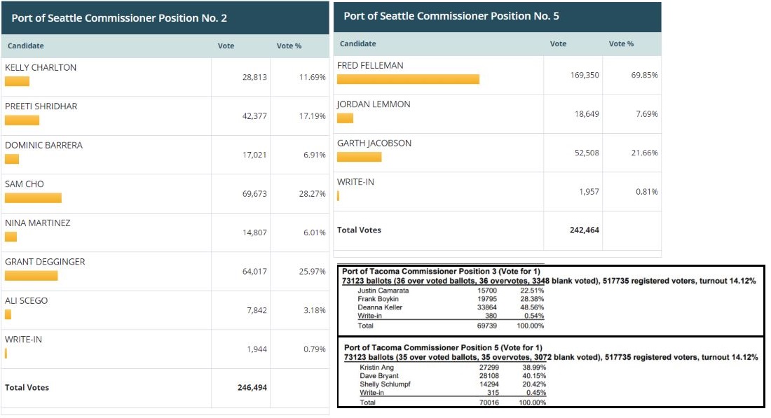 Both Seattle and Tacoma had Port Commissioner races in the primary elections. Beyond clear favor Fred Felleman for Seattle Port Commissioner Position No. 5, many of these races still have room to change with future result releases.