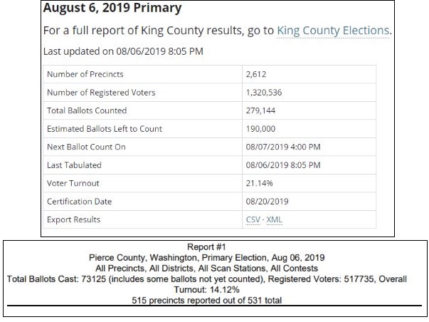 The next King County Election’s scheduled results release is Wednesday, August 7th at 4:00pm. Going forward results will be released daily (M-F) at 4:00 pm. Primary results will be certified August 20th. Pierce County will next release results on Wednesday, August 7th at 5:00pm. Going forward they also will release results daily (M-F) at 4:00pm. August 19th’s results will be released at 4:30pm. Pierce County will certify their primary results at 11:00am on August 20th.
