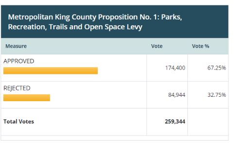 King County Proposition 1, which would replace an expiring tax levy. The funding the tax levy provides goes toward funding for county, town, city, parks; as well as for open space, trails, recreation, public pools, zoo operations, and an aquarium capital project.