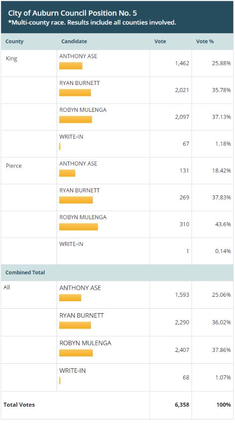 As Auburn is in both King and Pierce County, results for the City Council Position No. 5 come from both counties. The mutli-county results have Robyn Mulenga currently in the lead with 37.86%. Ryan Burnett is not far behind with 36.02%. Anthony Ase had the lowest vote share at 25.06%. These numbers are all subject to change as new results are tallied and posted in the coming days.