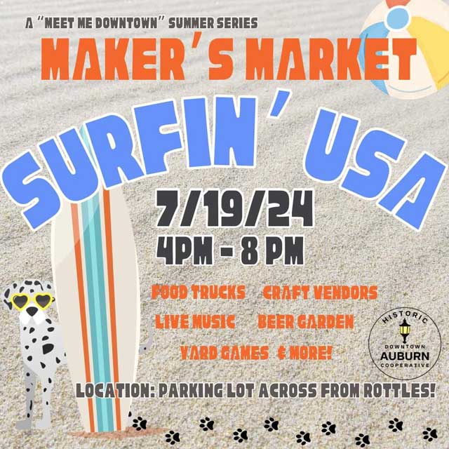 Auburn’s Maker’s Market will catch a wave and surf into downtown on Saturday, July 19, 2024 from 4 – 8 p.m.