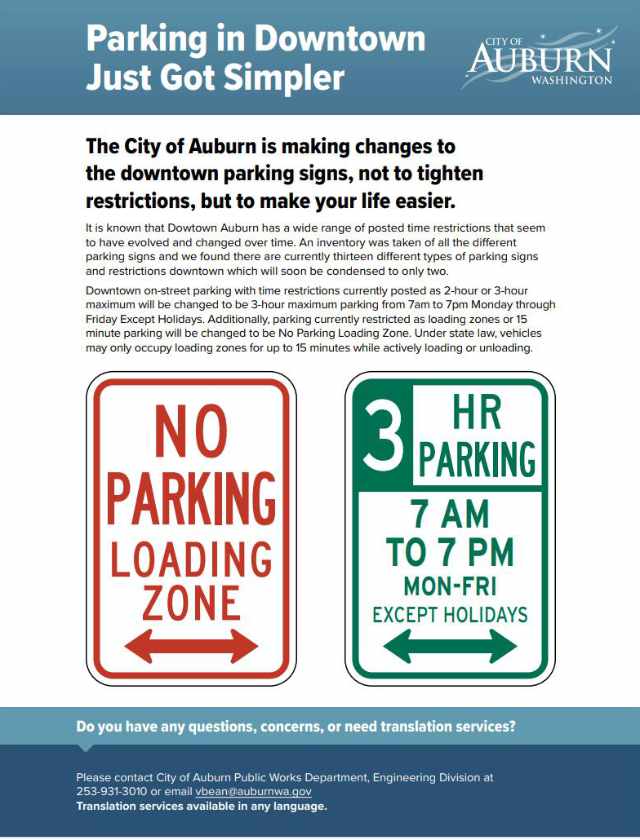 For more information, please contact City of Auburn Public Works Department, Engineering Division at 253-931-3010 or email [email protected]. Translation services are also available for those in need of assistance in other languages.