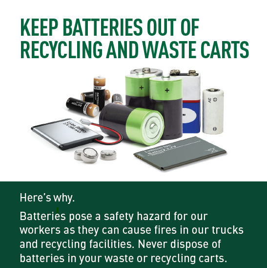 Lithium-ion batteries are considered hazardous waste and should never go in your curbside garbage or recycling cart. These batteries are often found in rechargeable electronics like phones, laptops, and electric toothbrushes. When punctured, damaged or exposed to high temperatures, they can cause fires and even explosions. This is a big risk when they end up in Waste Management recycling or garbage trucks! You can find drop-off locations by searching for rechargeable batteries at 1800recycle.wa.gov.