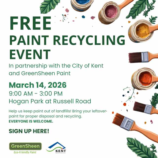 The City of Kent, in partnership with GreenSheen Paint, will host a Free Paint Recycling Event from 9 a.m. to 3 p.m. at Hogan Park at Russell Road (map below).