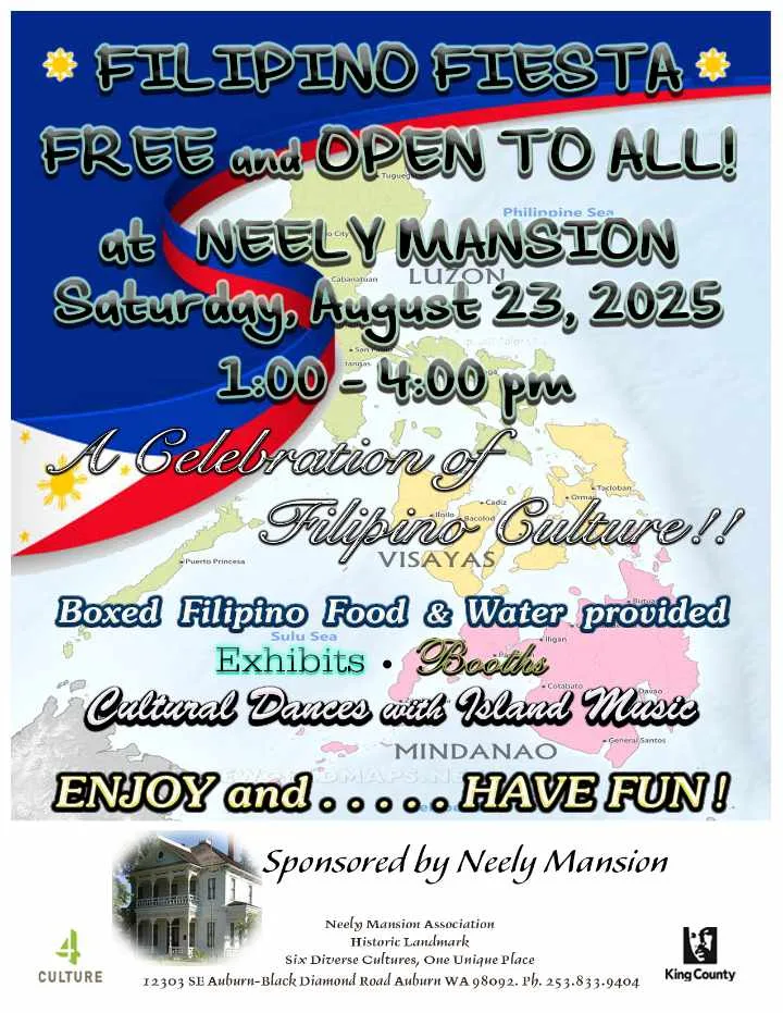 The Neely Mansion Association will host a free Filipino Fiesta on Saturday, Aug. 23, 2025, from 1 to 4 p.m., celebrating Filipino culture with music, dance, food and history.