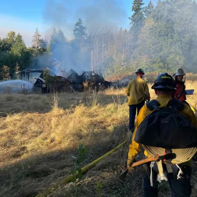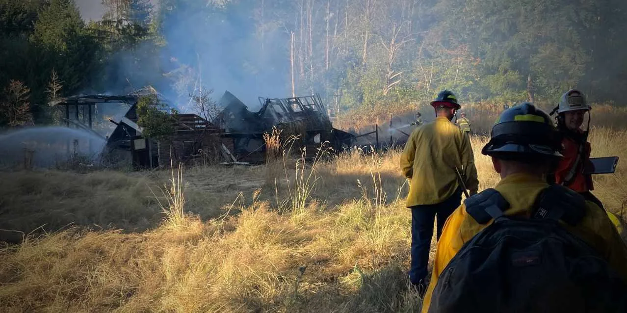 When they arrived, they found the building fully engulfed in flames, with the fire spreading to brush and trees.