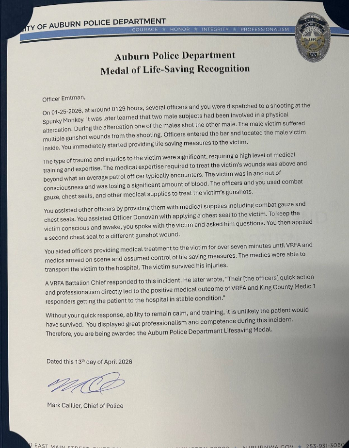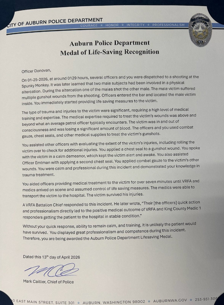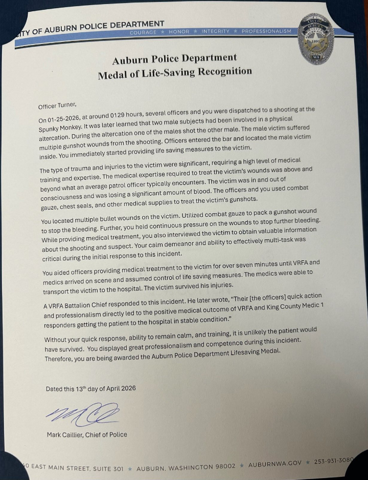Officers Donovan, Emtman, Ransier, Obregon and Turner were honored by the Auburn Police Department for their response to a shooting on Jan. 25, 2026, at about 1:29 a.m. at the Spunky Monkey, according to department materials.