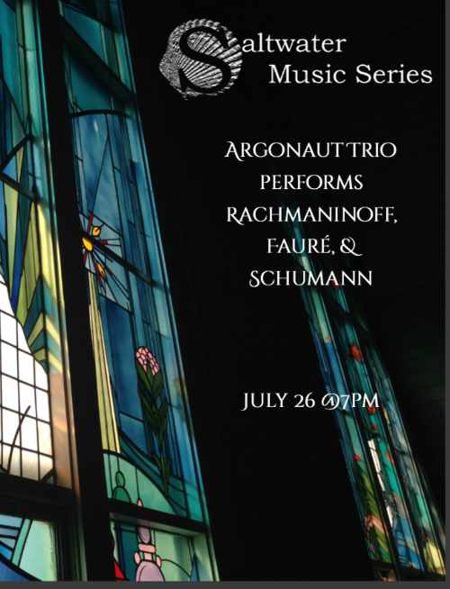 “The Argonaut Trio brings a program of Romantic works for piano, violin, and cello to the Saltwater Music Series. Pianist Alex Fang, (who was featured on our previous Saltwater Music Series concert in May), will be joined by Chantel Charis (violin) and Sophie Naden-Johns (cello), as they perform music by Sergei Rachmaninoff, Gabriel Fauré, and Clara Schumann.”