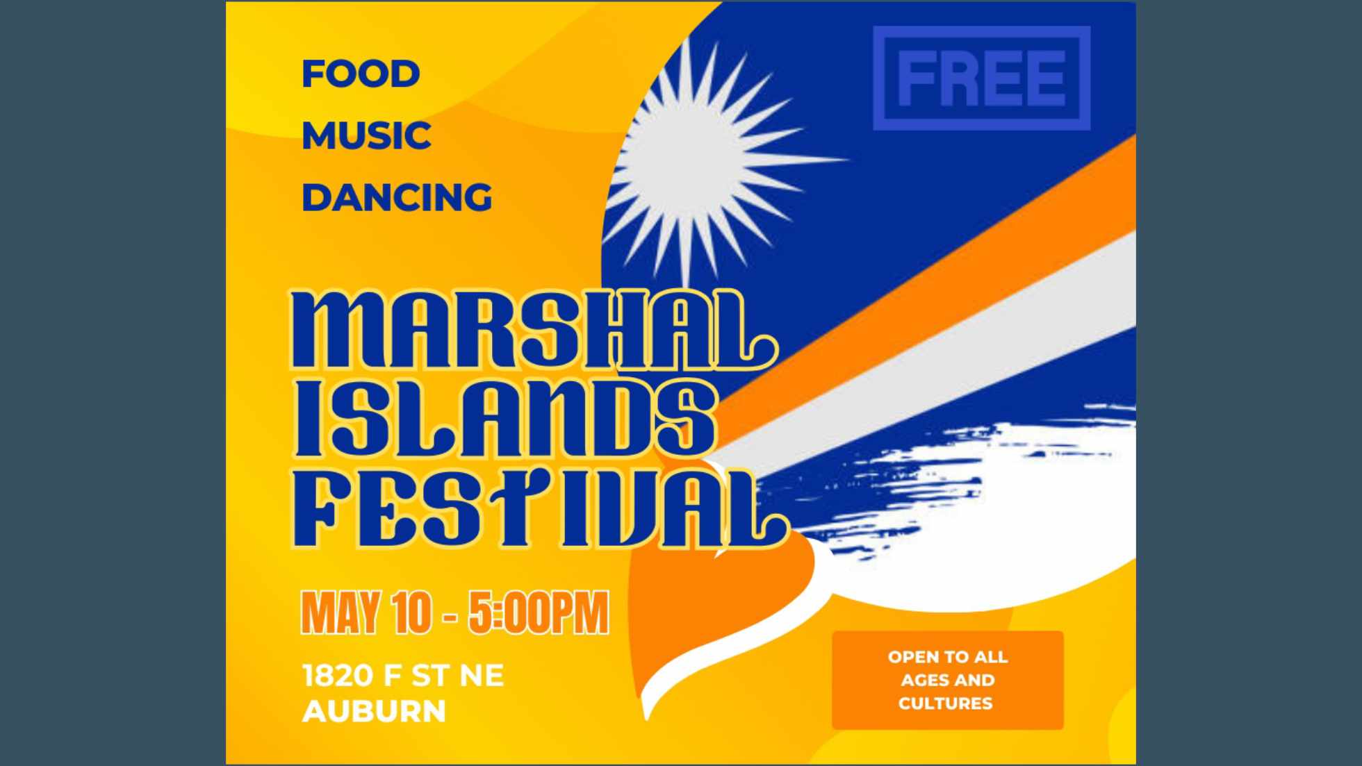 The family-friendly event will showcase the rich traditions of the Marshall Islands, featuring traditional food, music and dancing in an evening filled with island spirit and community connection.