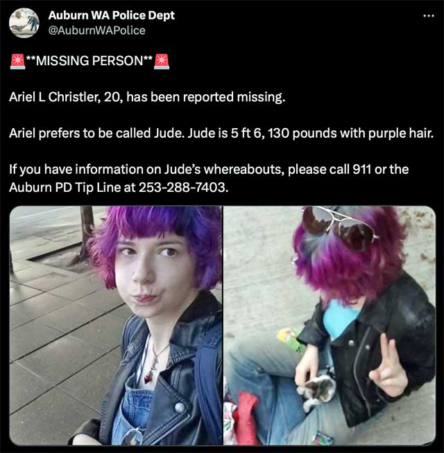 The Auburn Police Department has issued an alert regarding a missing person – Ariel L. Christler, a 20-year-old individual, has been reported missing.
