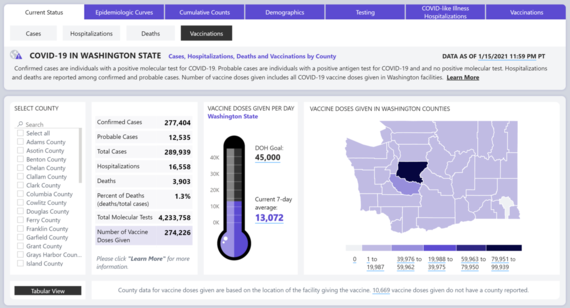 The Washington State Department of Health (DOH), in partnership with Microsoft AI for Health, is proud to announce vaccine data is now available on our dashboard, an addition that will help us share progress being made statewide as we endeavor to get COVID-19 vaccine to millions of people across the state of Washington.