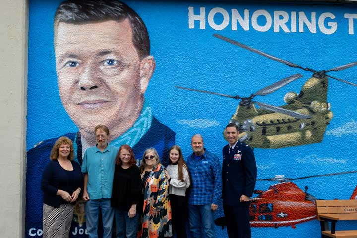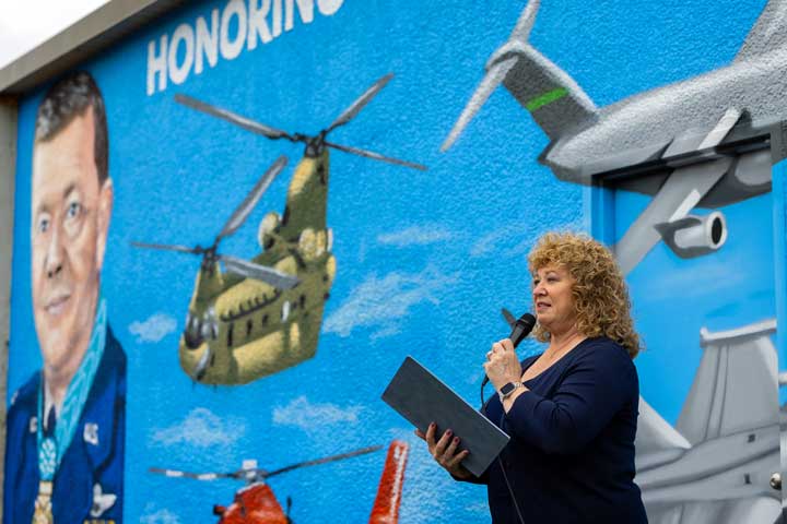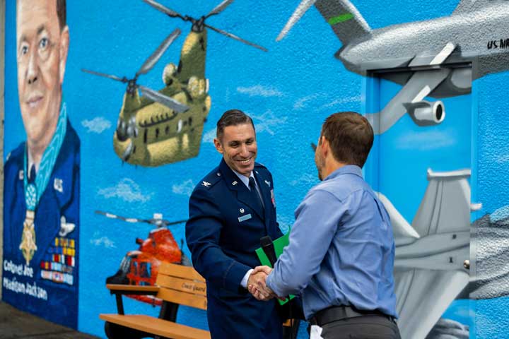 The mural, a collaborative effort by local artists and veterans’ groups, was funded by community donations and a grant from the city’s public arts program. It features symbolic imagery, including aircrafts, military insignia, and scenes representing different branches of the armed forces. A plaque beneath the mural provides a brief biography of Colonel Jackson and highlights his distinguished military career.