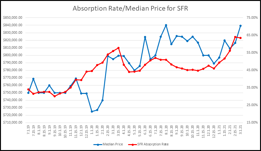 - Competition is driving prices higher…already about $45,000 higher since our winter low. So long as the absorption rate can stay high, escalation clauses will likely keep pushing prices even higher than where we’re at today in the weeks to come.