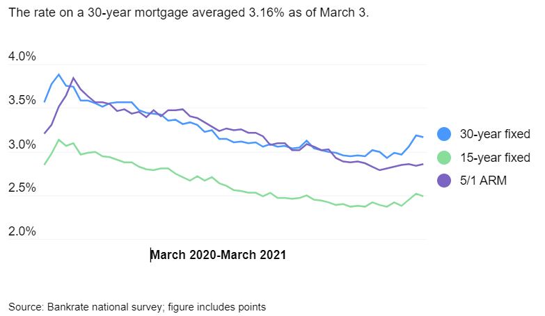 Per Bankrate’s survey of large lenders, the 30-year mortgage interest rate on purchases fell slightly this past week to 3.16%, with .32 in discount and origination points.
