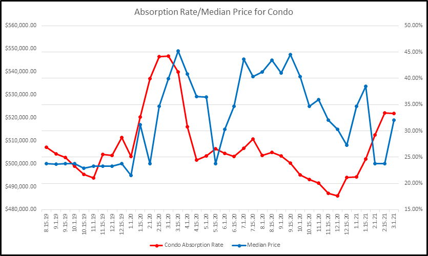 - A relatively high absorption rate gave us a strong floor for median condo prices to jump higher. So long as the absorption rate can stay strong, escalation clauses will likely keep pushing prices even higher than where we’re at today in the weeks to come.