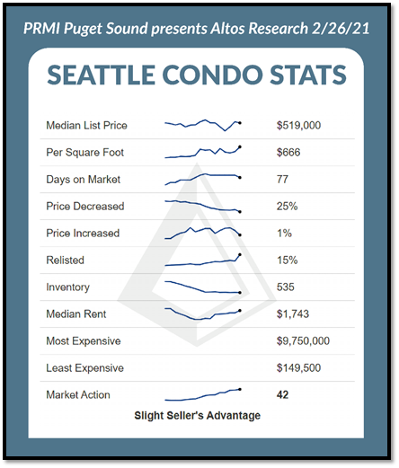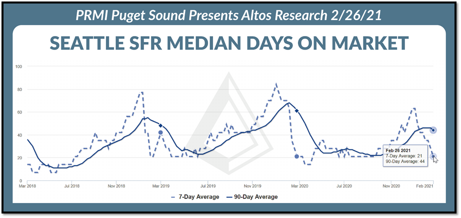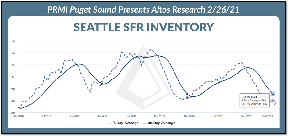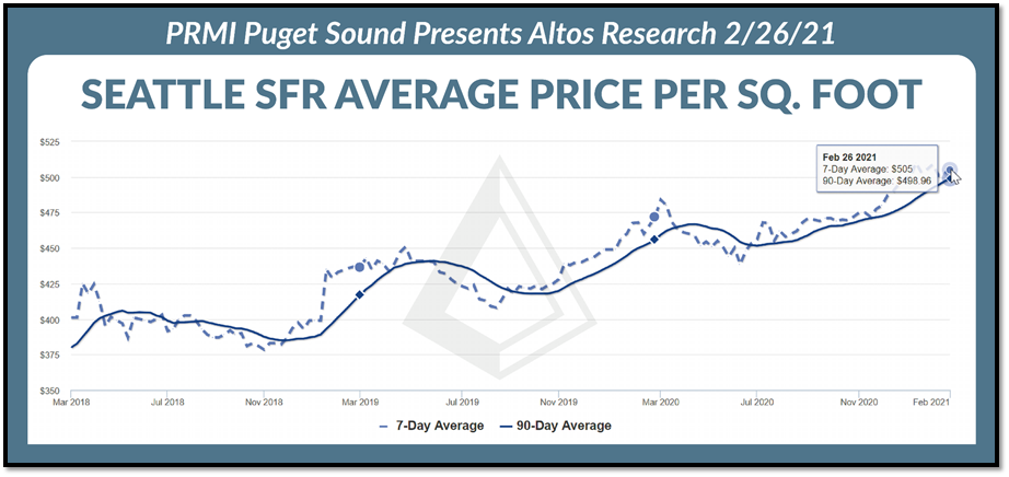 - Interest rates have risen due to inflationary fears with the latest stimulus package and relative herd-immunity in sight, but they’re about 1.5% lower than when we set our all-time record high Median List Price in March 2018 according to Freddie Mac – from 4.45% on March 22nd to 2.97% today. That doesn’t sound big, but if we take Freddie Mac’s interest rates and plug them into our handy-dandy mortgage calculator, that’s a difference in a monthly payment on a $500,000 mortgage/30-year term of $418.65 per month. Said another way, today’s buyers have 16.62% more purchasing power than 2018 buyers. Go one step further and add 16.62% to the 2018 record high Median List Price of $865,000, and all of a sudden, for a similar monthly expense as 2018 buyers, today’s buyers could bid the price of homes in Seattle up to over a million dollars ($1,008,763, to be exact).