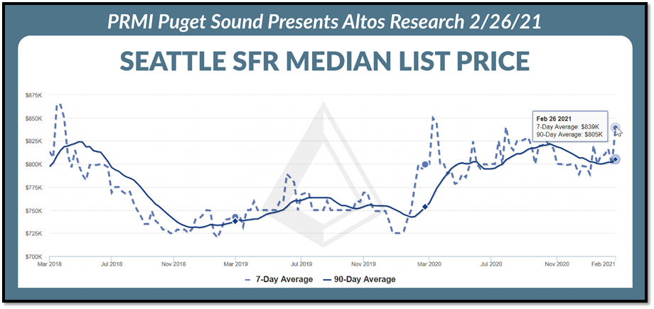 With a week over week increase in housing prices of five percent, Seattle is now close to its all-time high record Median List Price. According to Altos Research, for the week ending February 26th, the trailing 7 day average Median List Price for a single-family residence (including townhomes) was $839,000. The record was set March 23rd, 2018 at $865,000. That’s only 3.1% higher than where we’re at today.