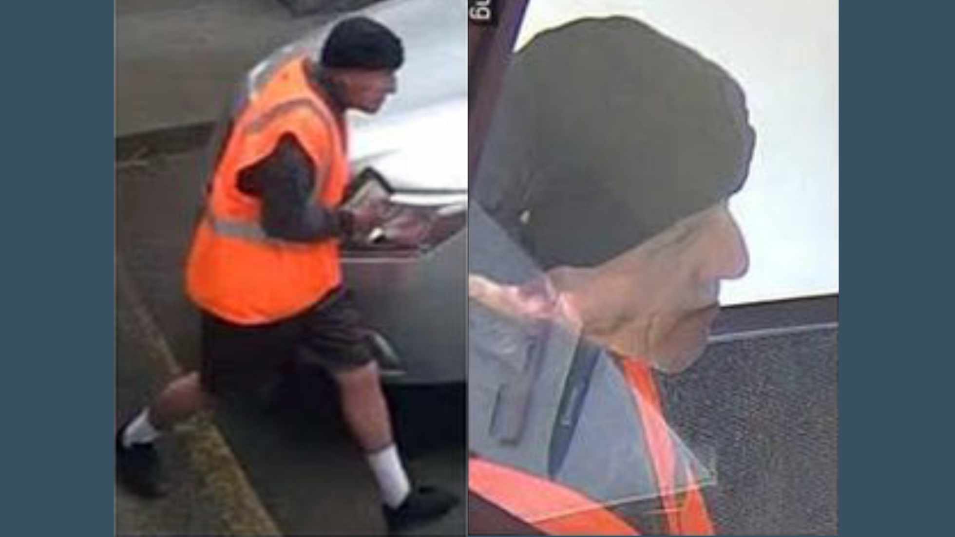 Surveillance images show the suspect wearing a black beanie, black face mask, and a bright orange safety vest.