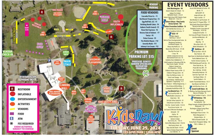 Auburn’s KidsDay will be held on Tuesday, June 25, 2024, from 11 a.m. – 4 p.m. at Les Gove Park (map below).