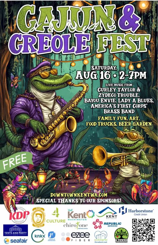 The Cajun & Creole Fest is supported by a range of sponsors including the City of Kent, 4Culture, Republic Services, KNKX, Seafair, Altha’s Cajun Spices, I Love Kent, and others.