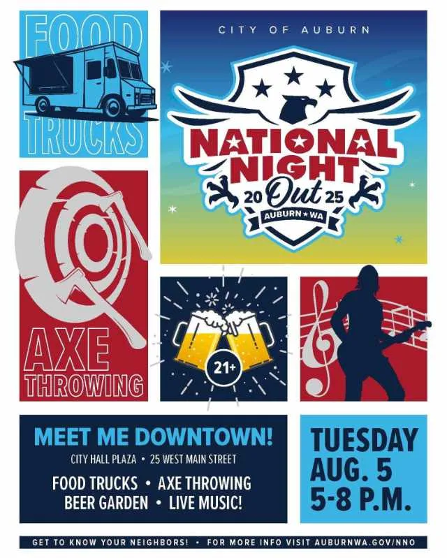 REMINDER: Auburn residents are invited to enjoy a free evening of music, food, and community fun at the city’s National Night Out event at City Hall Plaza this Tuesday, Aug. 5, from 5 to 8 p.m.