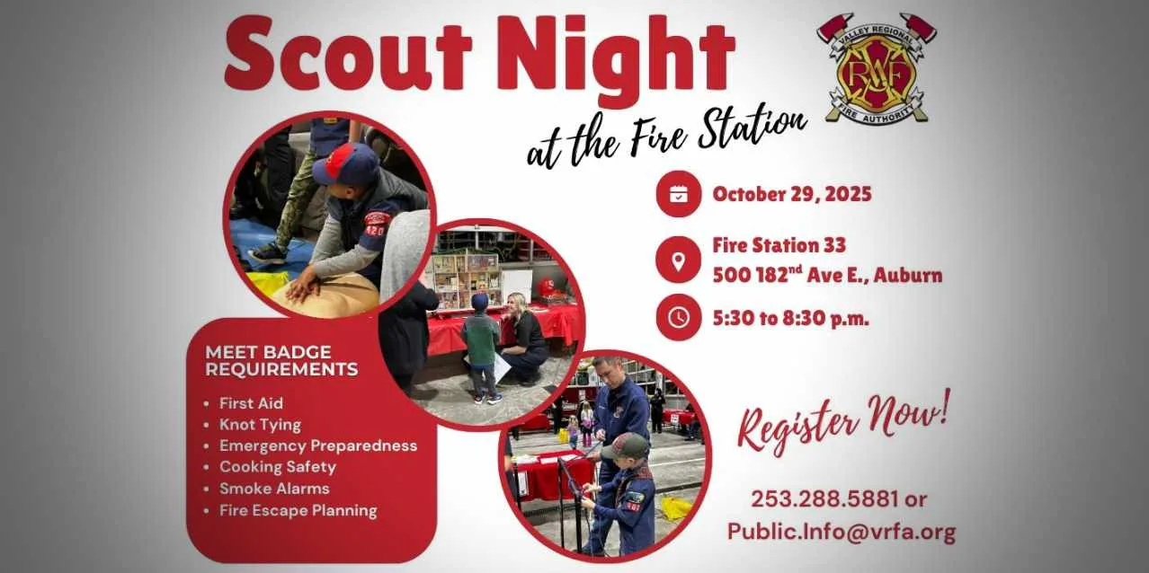 The free “Scout Night at the Fire Station” runs from 5:30 to 8:30 p.m. at 500 182nd Ave. E. (map below).