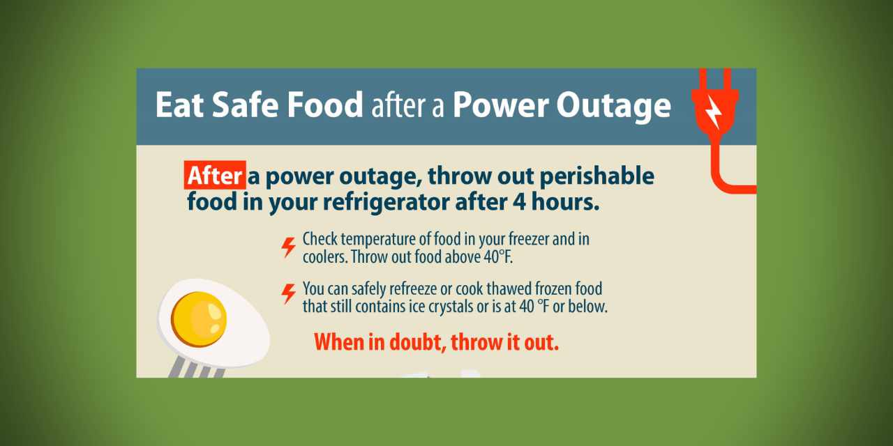 - Avoid food poisoning by keeping refrigerator and freezer doors closed. During long outages, move perishable food to a cooler, and keep it outside in the shade in cold weather. A full refrigerator can keep food fresh for about 4 hours, and a full freezer can keep food frozen for about 2 days. Throw out any food above 40°F in coolers and freezers.